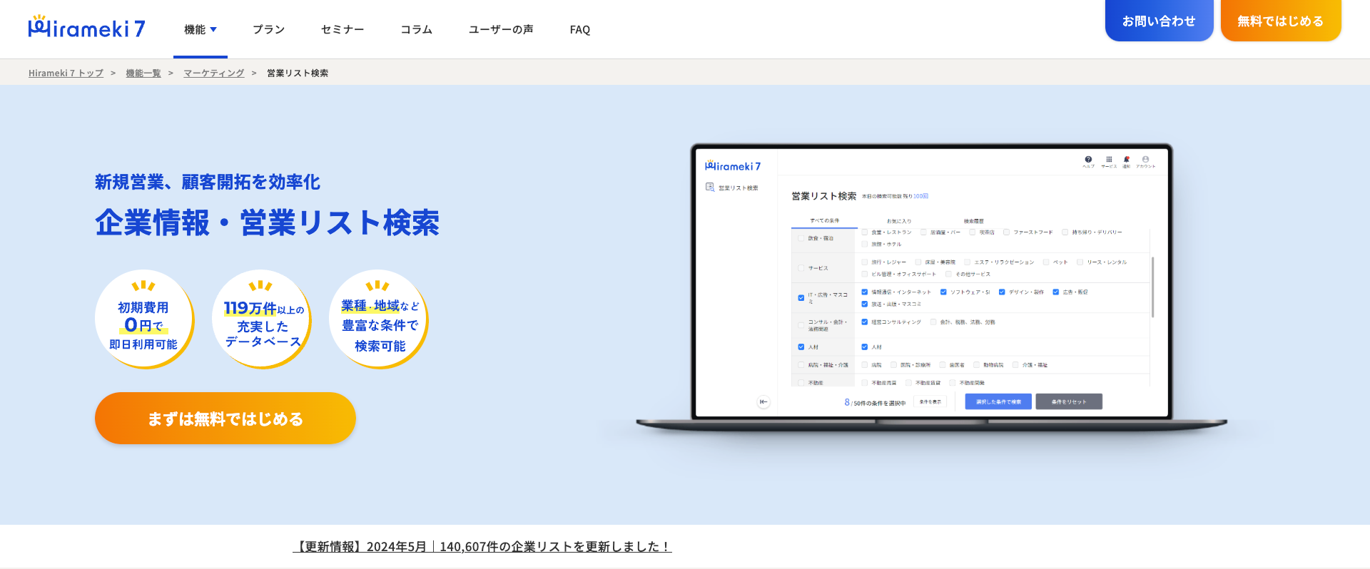「Hirameki 7 営業リスト検索」は約119万件の企業情報のダウンロードができるサービスです。