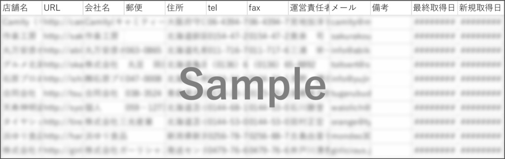 店舗名/URL/会社名/郵便/住所/メール/tel/fax/店舗説明/運営責任者/最終取得日/新規取得日