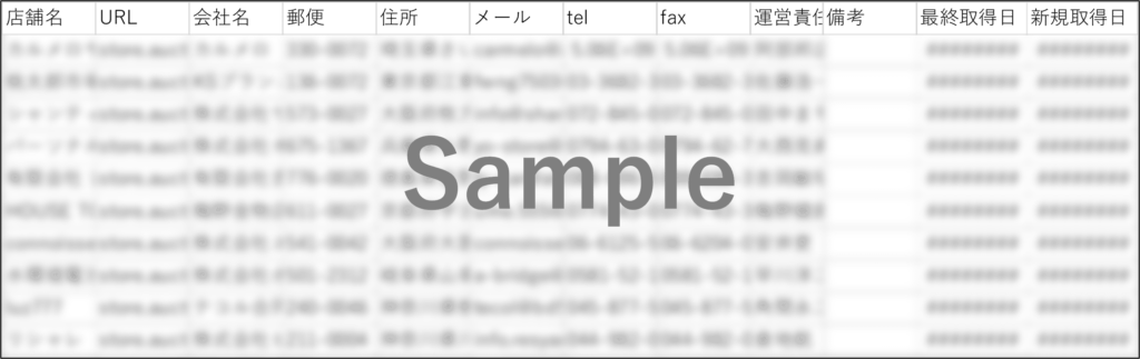 会社名/店舗名/郵便/住所/電話番号/FAX/メールアドレス/URL/備考/新規取得日/最終取得日