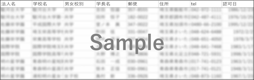 いきなりのリスト購入はハードルが高いですよね。そこで、私立学校法人名簿リストデータのサンプルを下記に掲載させて頂きました。