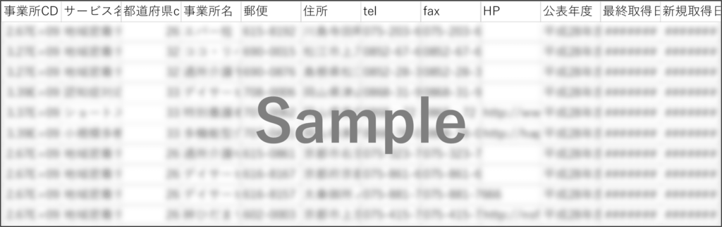 いきなりの購入はハードルが高いと考えている方も多いのではないでしょうか?そこで、介護サービス情報公表システムリストデータのサンプルを下記に掲載させて頂きました。