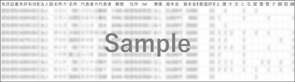 いきなりのリスト購入はハードルが高いですよね。そこで、建設業者リストデータのサンプルを下記に掲載させて頂きました。